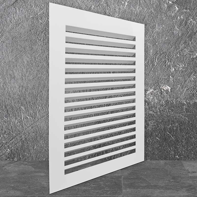 Представляет собой оцинкованный лист с отогнутыми ламелями на 30 мм, глубина рамки решетки равна толщине листа - 0,9 мм. Определяющими размерами (АхВ) при заказе являются габаритные размеры решетки.