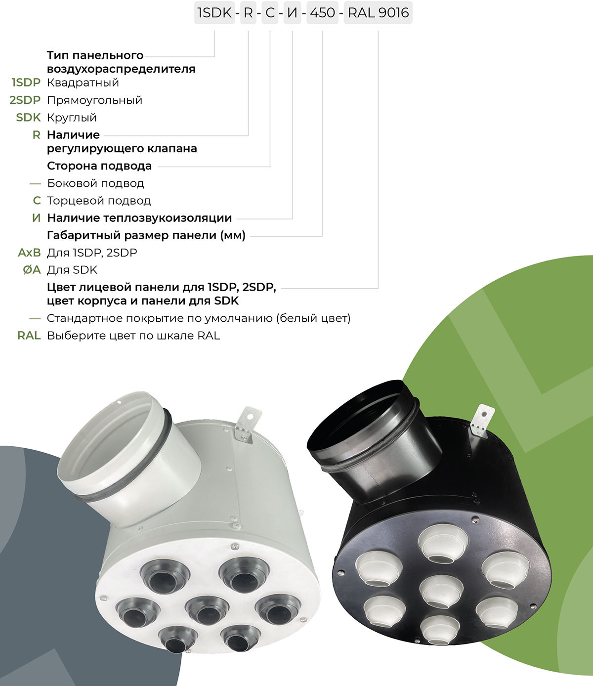 Конструкция SDK представляет собой панель круглой формы (SDK) с поворотными сопловыми ячейками, и камеры статического давления (КСД) с подводящим патрубком круглого сечения. Каждая сопловая ячейка имеет возможность поворачиваться и фиксироваться с отклонением до 30° вокруг оси симметрии. Возможно также изготовление соплового воздухораспределителя прямоугольной или квадратной формы 1SDP, 2SDP.