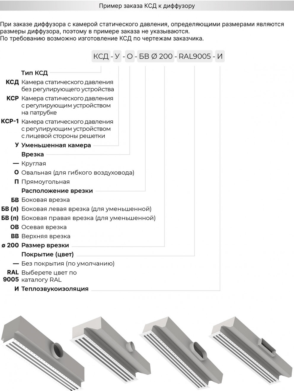 Для подключения к системе воздуховодов диффузоры могут комплектоваться камерой статического давления - КСД или КСР.