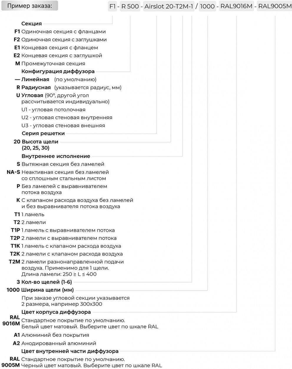Щелевые решетки Airslot изготавливаются из экструдированного алюминиевого профиля АД31 по ГОСТ 22233-2001. По умолчанию корпус диффузоров окрашивается в стандартный белый цвет RAL 9016 матовый, а внутренняя перфорированная кассета и ламели в чёрный цвет RAL9005 матовый. По индивидуальному заказу возможна окраска в любой цвет по шкале RAL как корпуса, так и внутренней части.