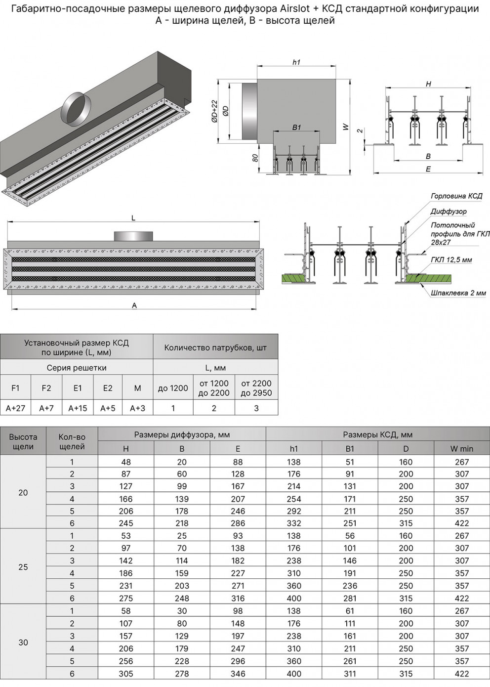 К воздуховоду щелевые решетки монтируются посредством камеры статического давления(КСД). Диффузор крепится саморезами к закладным деталям в КСД через крепежные элементы на тыльной стороне решетки. После установки диффузора к КСД, производится шпаклевка (под шпаклевку на диффузоре предусмотрена полка 2мм). Для лучшей адгезии финишного материала рамка имеет перфорацию.
