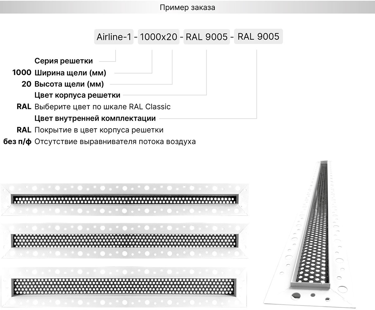 Щелевая скрытая решетка Airline-1 представляет собой декоративную рамку с перфорированной стальной кассетой внутри. После монтажа решетки, видимой частью в помещении остаётся только щелевой слот чёрного цвета. Для удобства монтажа рамка оснащена «полкой» 6 мм под соответствующую толщину гипсокартона или комбинации листов разной толщины. Отверстия в рамке улучшают адгезию финишного материала.